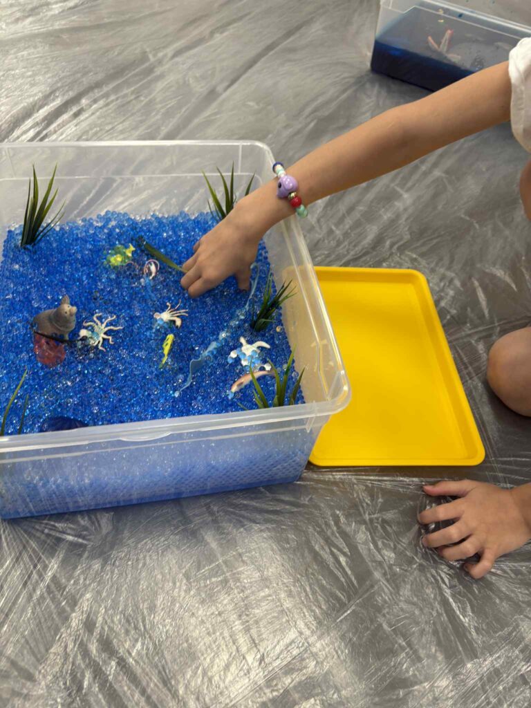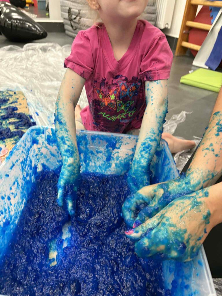 sensoryczna eksploracja z kulkami hydrożelowymi i niebieską galaretkąTe zajęcia były jak zanurzenie dłoni w spokojnym, letnim morzu. Bez pośpiechu, bez celu do „zrobienia”, za to z ogromną przestrzenią na doświadczanie. Kulki hydrożelowe i niebieska galaretka stworzyły środowisko, które było jednocześnie chłodne, śliskie i kojące.Już sam kolor działał regulująco – niebieski wycisza, uspokaja i pomaga się skupić. A kiedy dzieci zanurzały dłonie w „morskiej tacy”, świat na chwilę zwalniał.